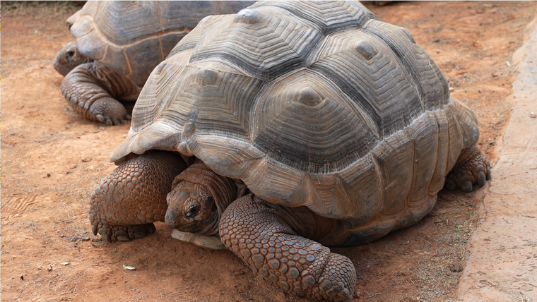 亚达伯拉象龟,将“佛系”通勤演绎到了极 致 , “大绿豆”和“小绿豆”的通勤距离只有 10 米左右,但是却需要 30 分钟才能到达“工位”,两只亚达伯拉象龟作为世界第二大陆龟,保育员无法搬动它们,每天只能跟在它们后面,等着它们走两步歇一会儿,慢悠悠地挪到工位后,开始享用保育员精心搭配好的早餐。亚达伯拉象龟主要在清晨和傍晚不到四个小时内活动,每天的早餐主要以生菜、紫甘蓝、彩椒、黄瓜及补充微量元素的龟粮为主,成年雄龟体重可达 250kg 左右,成年雌龟体重可达 160kg 左右。
